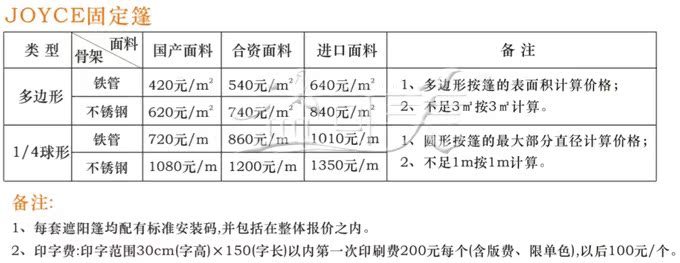 根據外形及面料的搭配可以制作成各種款式,它既可以遮陽擋雨,實現全天候的保護,而且是商業上即不貴,又顯目 完美的活招牌。結構簡單大方,遮陽的同時不阻擋風景。