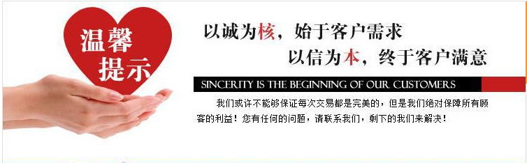 我們非常珍惜每一位顧客,非常重視每一位顧客的信用好評,我們力求做到服務上的***。如果您有任何不滿,請先跟我們溝通,相信合理的問題都可以迅速為您解決。愉快的交易是建立在充分溝通和互相尊重的基礎上的,請珍惜我們的緣份,及時給予負責任的評價,感謝您的支持!