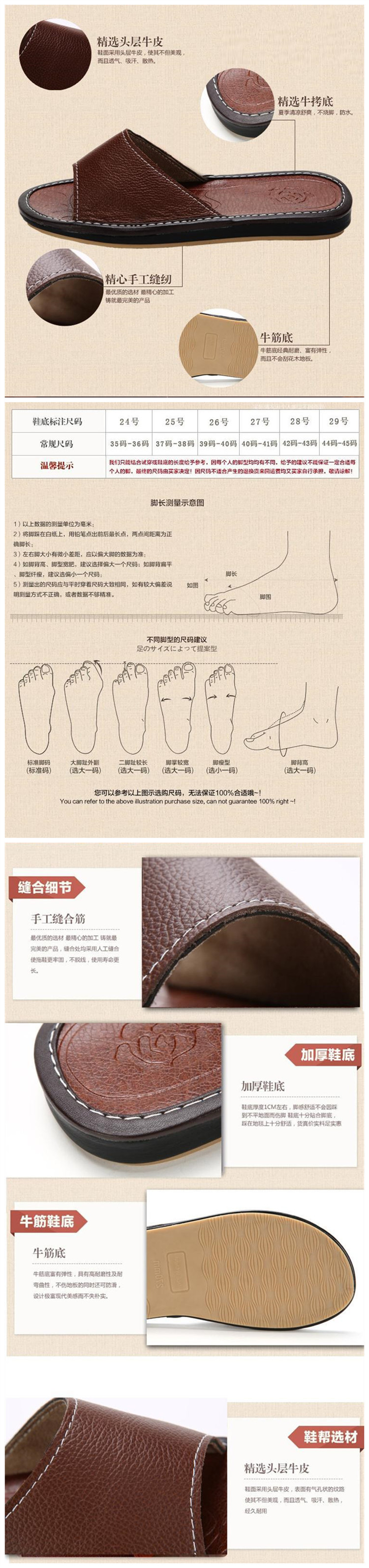 【鞋底材質】:加厚牛筋底防水防滑, 耐磨,不傷地板! 【洗滌方式】:皮質好打理,臟處可用濕毛巾擦洗,再用毛巾擦干,置陰涼處風干。 【關于尺碼】:此拖鞋尺碼標準,腳型偏寬偏胖或習慣寬松的加大1碼更舒服,我們的建議僅供參考。 【特別說明】:本款拖鞋是100%頭層牛皮的,因每張牛皮有個體差異,不同批次顏色與圖片會有略微色差 真牛皮和假皮的優缺點。 真牛皮是牛的自然纖維,不會開裂,使用時間是假皮的5倍以上。而假皮成分中的油性在空氣中暴露揮發完以后,就會自動開裂,那么開裂之后的鞋子也就沒用了!