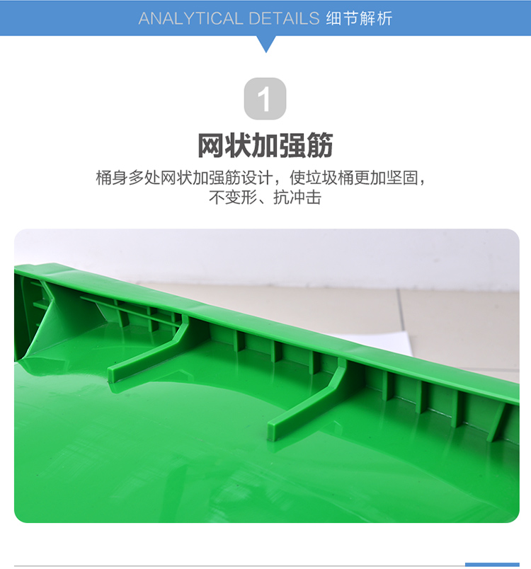 1.垃圾桶的桶身多處網狀加強筋設計,使垃圾桶更加堅固,不變形,抗沖擊