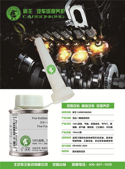 CarbonKing碳王? 燃油添加劑(TW-570100)采用德國(巴斯夫)先進環保技術配方,用于汽車純汽油中,CarbonKing碳王? 燃油添加劑含第五代清凈分散劑,能充分清除燃燒室各部件上形成的積碳并抑制積碳沉積,保證發動機在良好的狀態下工作;促進燃油二次燃燒,使用后明顯感到油門輕、提速快、發動機運轉順暢;提高燃油燃燒率,降低發動機對燃油辛烷值的要求,減少汽車油耗;提高燃油燃燒值,降低機體的磨損,延長發動機的使用壽命。