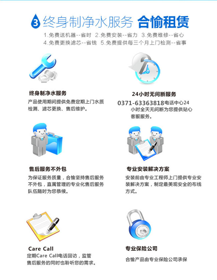 3保證服務質量:根據原水水質每3-6個月更換1/2/3級濾芯,8-12個月更換5級濾芯,15-24個月更換4級濾芯,租賃期內,所有耗材及配件均有我公司免費提供,租滿三年后直飲機歸用戶所有,產品壽命均在10年以上